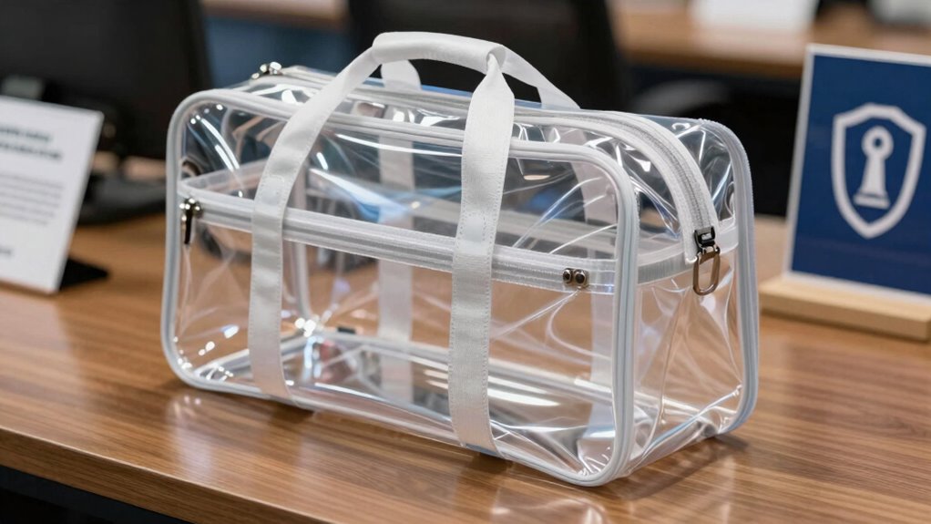 Clear bags are often recommended but not always mandatory, depending on the venue’s security protocols. You should check the specific bag check procedures beforehand, as some places enforce strict rules requiring clear bags for easier screening. Bringing a clear bag can speed up entry, but if non-clear bags are allowed, be prepared for additional security checks. Always verify venue policies to make certain of smooth entry and adherence to security measures.