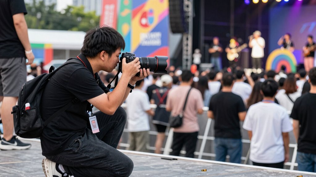 When you’re filming in public or private spaces, practicing good etiquette isn’t just polite—it’s essential for maintaining a respectful environment. One of the key aspects to contemplate is how you choose your camera angles. You want to capture your subject clearly, but you also need to be mindful of the people around you. Avoid shooting from angles that intrude on others’ personal space or block their view. For example, shooting from a low or high angle can sometimes be distracting or invasive if it’s not done thoughtfully. Instead, aim for angles that respect the surroundings and the people within them. This shows you’re considerate of others’ experience and helps prevent your footage from becoming a nuisance.