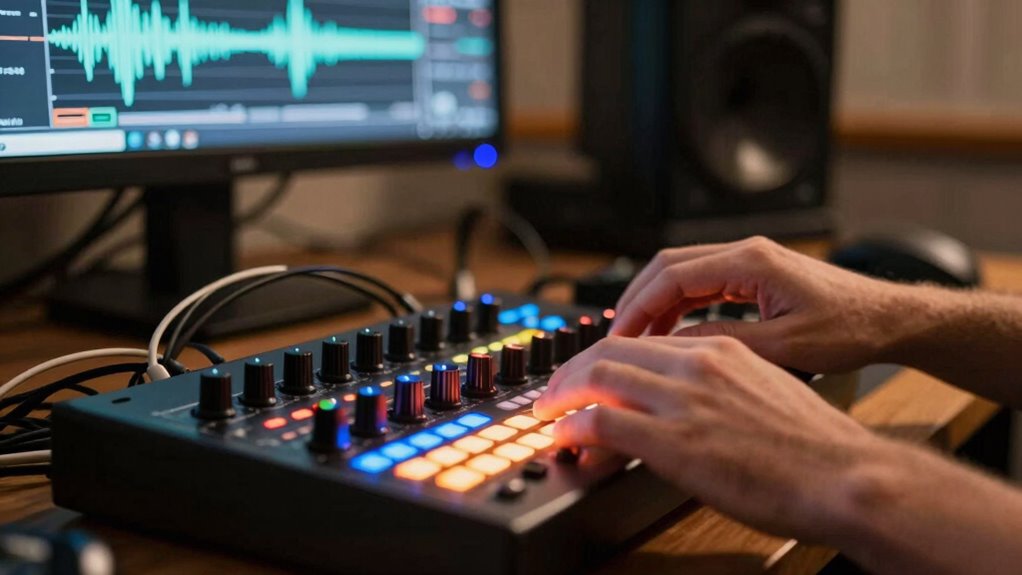 Using an external audio interface can dramatically reduce monitoring latency, making it feel almost instant. The right audio interface selection is vital; some models are built specifically to minimize delay, so your recordings feel natural and responsive. Without it, you might experience sluggish monitoring that messes with your flow. Invest in a quality interface, and you’ll notice your latency drops considerably, creating a smoother, more professional recording experience.