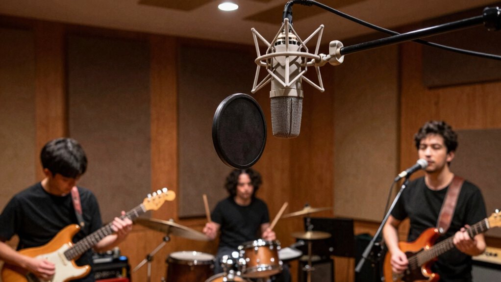 Imagine capturing the essence of your band’s energy—where do you position your mic? Start by placing it at the center of the room, slightly above head height, to embrace room acoustics and balance all instruments. Keep it equidistant from each player, avoiding corners or reflective surfaces that could distort sound. Adjust microphone placement until you find the sweet spot, revealing a full, immersive sound that tells your band’s story.
