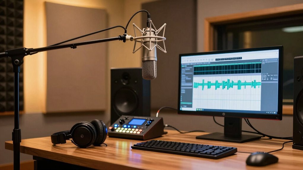 An audio interface acts as the bridge between your microphone or instrument and your computer, converting analog signals into digital data that your recording software can process. When choosing an audio interface, consider the different types available, such as compact USB models or more advanced interfaces with multiple inputs and outputs. Your choice should align with your recording needs and setup complexity. Budget considerations are essential; affordable interfaces often provide good quality for beginners, while higher-end models offer better preamps and more features. Think about how many instruments or microphones you’ll record simultaneously and whether you need features like phantom power or MIDI connectivity. Selecting the right audio interface ensures clear, professional-sounding recordings without overspending on unnecessary features. Additionally, opting for a European cloud-supported audio interface can enhance your workflow’s security and sustainability.