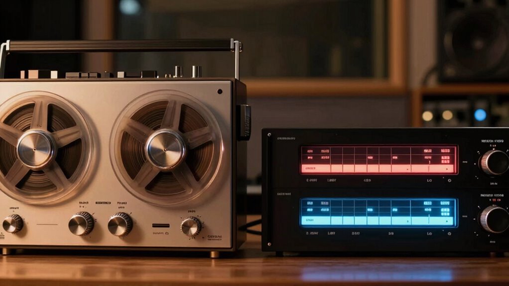 High-quality digital gear can closely replicate analog sound, but achieving perfect analog fidelity remains challenging due to digital artifacts. You might notice digital gear captures the warmth and nuance of analog, but subtle differences persist. While advanced converters and processing help bridge the gap, some audiophiles argue that digital still can’t fully emulate the organic qualities of analog. Ultimately, your preference depends on how critical authentic analog sound feels to you.