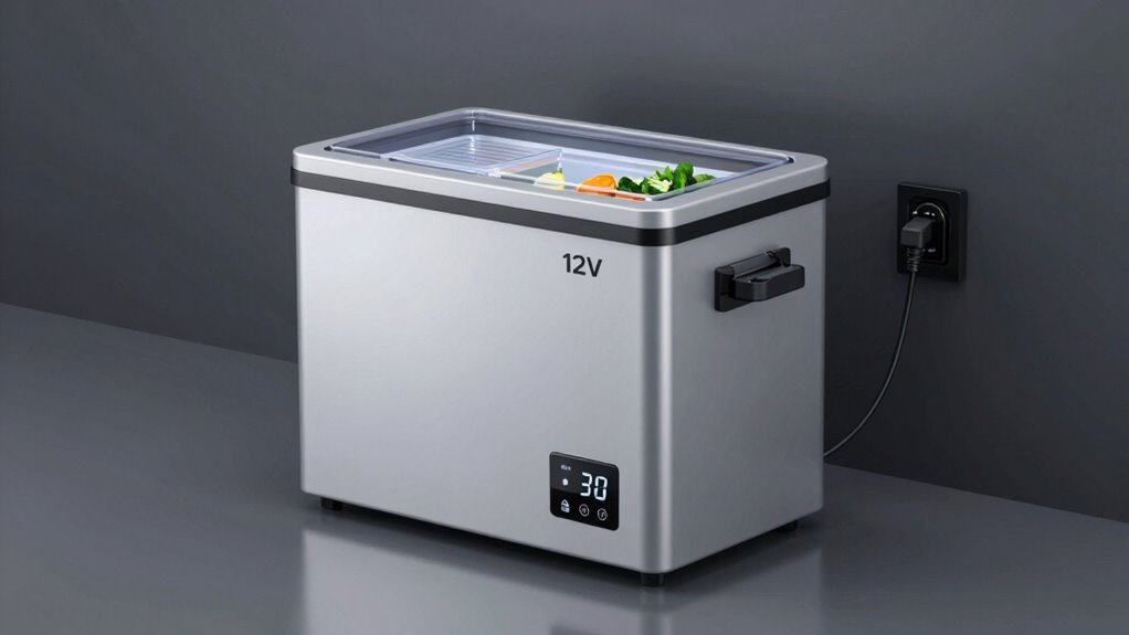 A 12V portable refrigerator freezer’s specs include capacity, which ranges from 20 to 50 liters to suit your trip length and group size. Power draw is key—it affects how much your vehicle’s battery drains; selecting energy-efficient models helps. To keep temps stable, look for units with digital thermostats, good insulation, and dual zones if needed. Understanding these features guarantees you select a reliable unit—keep exploring to learn more details for your adventures.