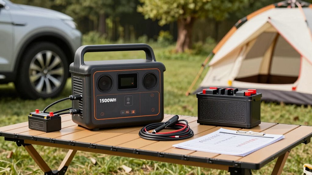 Setting up your portable power station correctly guarantees dependable power when you need it most. When you’re out car camping, having a trustworthy power source can make all the difference, but only if you handle it properly from the start. One of the most critical aspects is paying attention to battery safety. Always read the manufacturer’s instructions carefully before handling the unit. Keep the power station in a cool, dry place to prevent overheating, which can compromise the battery’s integrity and safety. Avoid exposing it to extreme temperatures or direct sunlight, as this can cause the battery to swell or even become hazardous. When it comes to battery safety, never attempt to open or modify the power station yourself, as this can lead to dangerous chemical leaks or short circuits. Also, ensure that any damage to the device, such as cracks or leaks, is addressed immediately—using a damaged battery can pose serious safety risks. Additionally, understanding the battery chemistry helps you better grasp how to handle and maintain the power station safely. Another key point is following proper charging tips to keep your power station functioning at its best. Before you start charging, verify that you’re using the correct charger provided by the manufacturer or an approved alternative. Using incompatible chargers can result in overcharging or undercharging, both of which degrade the battery and shorten its lifespan. Always charge in a well-ventilated area and avoid leaving the power station plugged in for extended periods after it reaches full capacity. Overcharging can lead to overheating and reduce the overall lifespan of the battery. When setting up for charging, check that connections are secure and that cords are not frayed or damaged, as faulty wiring can cause shorts or fires. If your power station has a display or indicator lights, monitor them during charging to ensure it’s operating within safe parameters. Additionally, avoid charging the device in excessively hot or cold environments, as temperature extremes can impair battery performance and safety. Proper storage after use is just as crucial. Store your power station with a partial charge—about 50-70%—to maintain battery health. This prevents the battery from going into a deep discharge state or becoming overly charged during periods of inactivity. Regularly inspect the device for any signs of damage or corrosion, and always follow the manufacturer’s recommendations for storage and maintenance. By paying attention to battery safety and adhering to proper charging tips, you’ll ensure your portable power station remains reliable and safe for all your car camping adventures. Taking these precautions helps prevent common mistakes that could otherwise lead to damage, safety hazards, or reduced performance when you rely on it most.