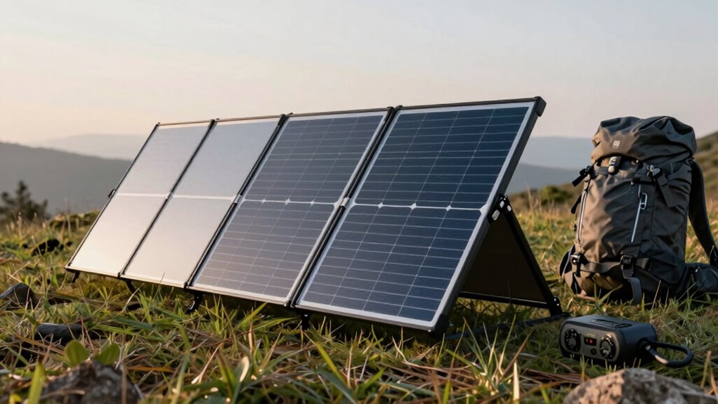Foldable solar panels are quite durable in harsh weather conditions thanks to their weather resilience and material strength. You’ll find that high-quality panels are built with rugged materials like tempered glass and sturdy frames, making them resistant to rain, snow, and wind. Just guarantee you choose panels specifically rated for tough environments, and you’ll enjoy reliable performance even during extreme weather, protecting your off-grid power needs.