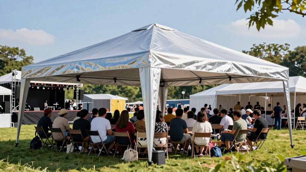 Remember, it’s better to have a little extra shade than not enough, especially when hosting outdoor concerts. By considering your space, guest count, and ease of setup, you’ll make a smart choice without overbuying. Think of it as “a stitch in time saves nine”—investing wisely now prevents bigger headaches later. With the right canopy, you’ll create a comfortable, inviting atmosphere that keeps everyone cool and enjoying the show.