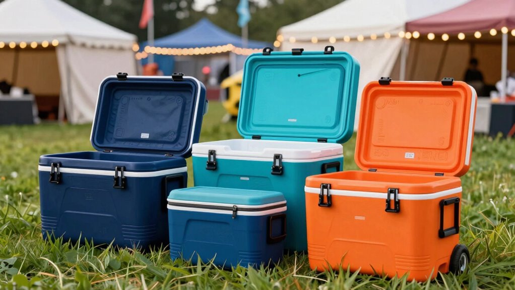 A typical soft-sided cooler can hold between 12 to 30 quarts, depending on its size and design. You’ll find various storage options like multiple compartments, bottle holders, and external pockets that help maximize capacity. Consider how much food, drinks, and ice you need for your festival camping trip, then choose a cooler with the right capacity to keep everything organized and easily accessible without overpacking.