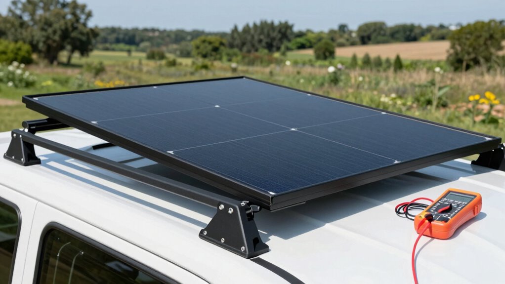 Rigid solar panels are quite durable in harsh weather, thanks to their weatherproofing and rigorous durability testing. They withstand rain, snow, and strong winds better than flexible panels, making them ideal for van camping. Properly sealed and quality-tested panels resist corrosion and damage over time. To guarantee longevity, look for panels with high durability ratings and solid weatherproofing features, so they keep performing well regardless of the weather conditions you encounter.