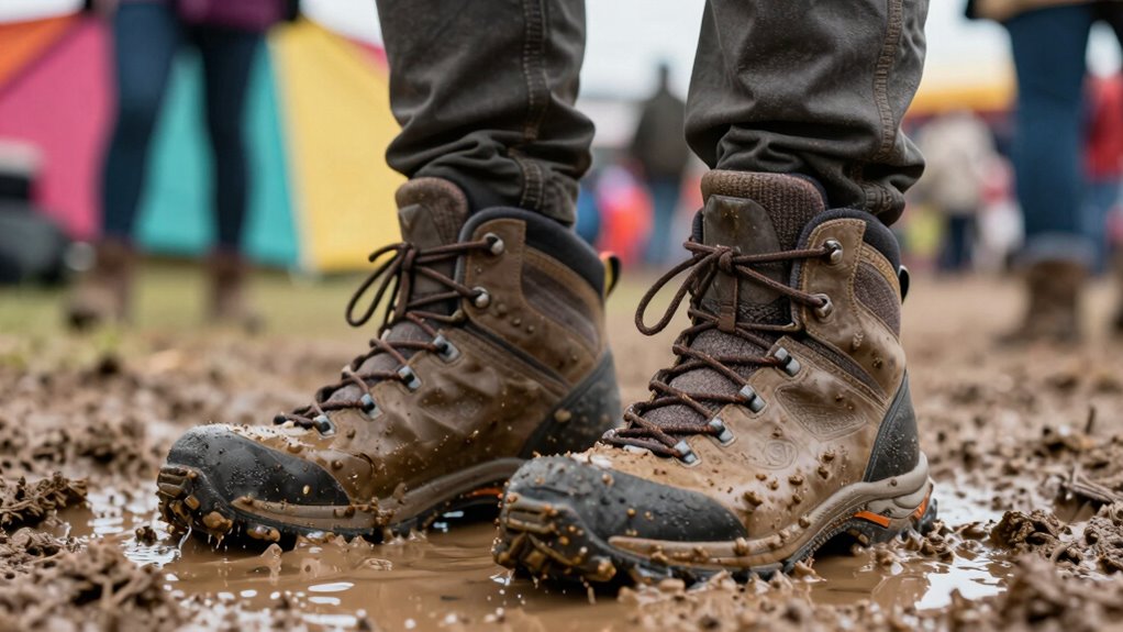 Imagine gripping the muddy terrain like a mountain goat—your best bet is a sole with deep, aggressive lugs. Look for a sole with excellent sole grip to prevent slipping and high sole durability to withstand rough, muddy conditions. Vibram soles, with their multidirectional tread, offer superior traction, ensuring you stay steady. Choosing boots with these features keeps you secure, confident, and ready to tackle even the muddiest festival grounds.