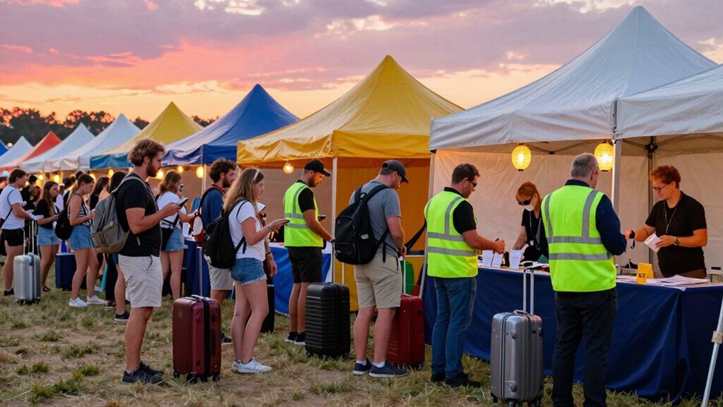 You can arrive early or late for check-in, but it’s best to check the festival’s early arrival policies and late check-in procedures beforehand. If you arrive early, you might need to wait until check-in officially opens, and late arrivals may face different procedures or restrictions. To avoid hassle, plan your arrival time accordingly, and stay informed about specific rules so you can move through check-in smoothly.