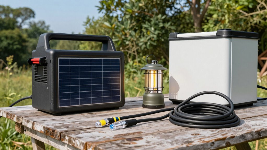 Are you prepared to set up a safe and reliable power system at your campsite? Guaranteeing safety is essential, especially when dealing with electrical equipment. Starting with battery safety, always handle batteries carefully, avoiding punctures or leaks that can release harmful chemicals. Use proper containers and keep batteries away from heat sources or open flames. Make certain your batteries are in good condition, with no corrosion or damage, to prevent accidents. When connecting batteries, follow manufacturer instructions precisely, and never overload the system. Using the right cables and connectors is crucial; thick enough wires prevent overheating and assure efficient power flow. Keep your batteries secured in a well-ventilated area, and avoid stacking them on uneven surfaces to prevent tipping or damage. Proper ventilation is vital for both batteries and generators to prevent buildup of dangerous gases. Adequate ventilation also helps disperse any potentially toxic fumes, ensuring a safer environment around your power setup. Maintaining a clean and organized workspace around your batteries can further reduce the risk of accidents, especially when handling electrical components. Regularly inspecting your equipment and practicing good safety protocols can significantly lower risks of mishaps. Additionally, understanding battery chemistry is important to handle different types safely and effectively.