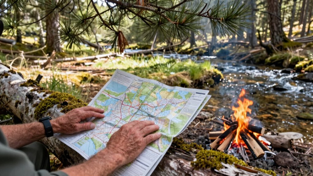 Using maps effectively is essential for locating campsites that offer privacy and solitude away from crowds. Sharpen your navigation skills by understanding map symbols, which reveal trail types, water sources, and terrain features. Look for less-traveled routes or smaller side trails that can lead to quiet, hidden spots. Pay attention to contour lines to avoid steep, exposed areas, and identify natural features like thick woods or rocky outcroppings that provide cover. Use topographic maps to find secluded clearings or flat areas away from main paths. Remember, a well-read map helps you plan a route that steers clear of popular sites, ensuring you find a peaceful campsite away from crowds. Understanding terrain features can greatly enhance your ability to select the perfect hidden spot.