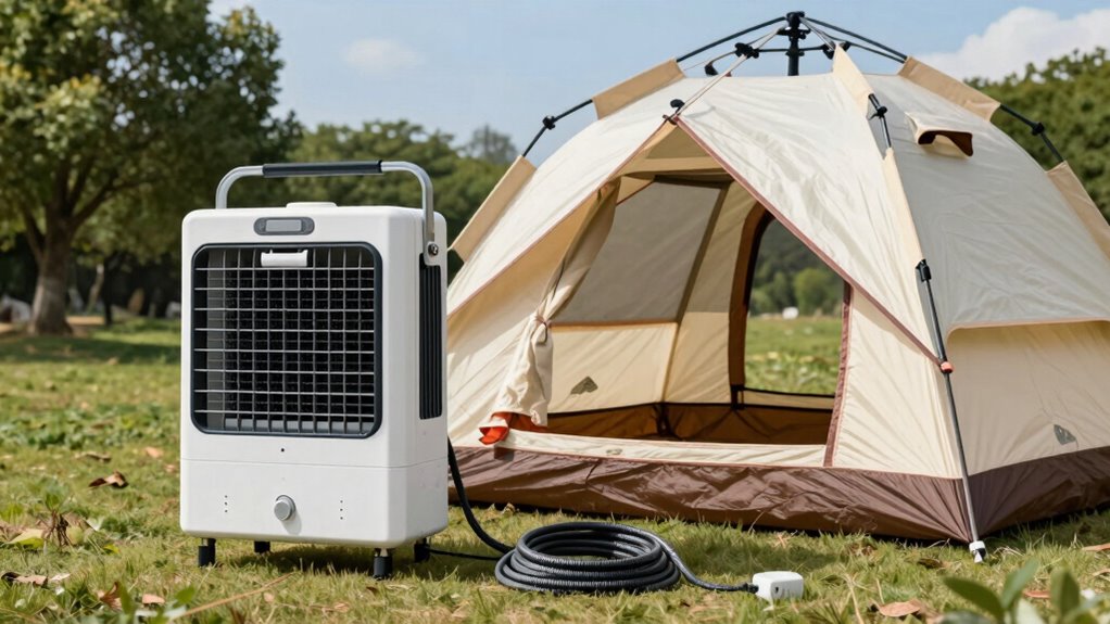 Setting up a portable evaporative cooler can make your tent camping experience much more comfortable, especially in hot weather. To guarantee it operates smoothly, you need to pay close attention to your power source and water supply. First, check that you have a reliable power source nearby. Many coolers run on standard electrical outlets, so if you’re camping in a remote location, consider whether you need a portable generator or an extension cord rated for outdoor use. Avoid using makeshift power setups that could cause electrical hazards or damage your cooler. Make sure the power supply matches the cooler’s requirements to prevent overloads or insufficient power, which could lead to malfunction or damage. Additionally, verify that your power source provides a stable and consistent supply to prevent interruptions during operation.