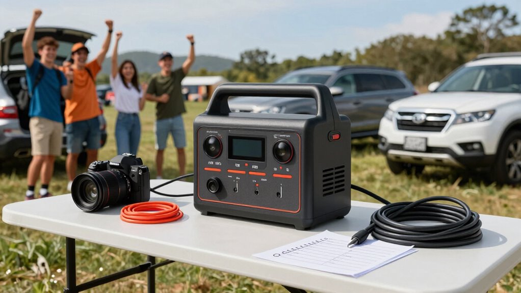You can run multiple devices simultaneously on a portable power station for several hours, depending on its battery capacity and your devices’ power consumption. Larger capacity stations with higher watt-hour ratings last longer, even with multiple devices running. Keep track of each device’s power needs, and avoid overloading the station. By managing your power consumption wisely, you guarantee your devices stay powered throughout your event without unexpected shutdowns.