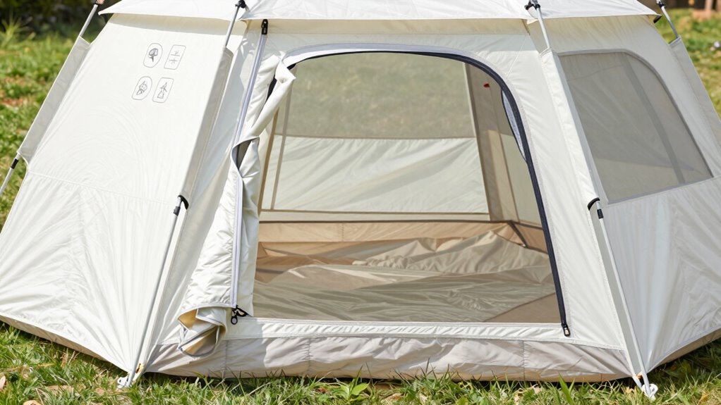 Understanding portable privacy tent specs helps you pick the right model for your outdoor needs. Season ratings show whether the tent is suitable for 3 or 4-season use, meaning warmer or colder conditions. Insulation options keep you warm in cold weather, while UV protection shields you from harmful rays. Good ventilation prevents condensation and keeps the interior comfortable. Keep exploring to learn how these features can make your outdoor experience better and more comfortable.