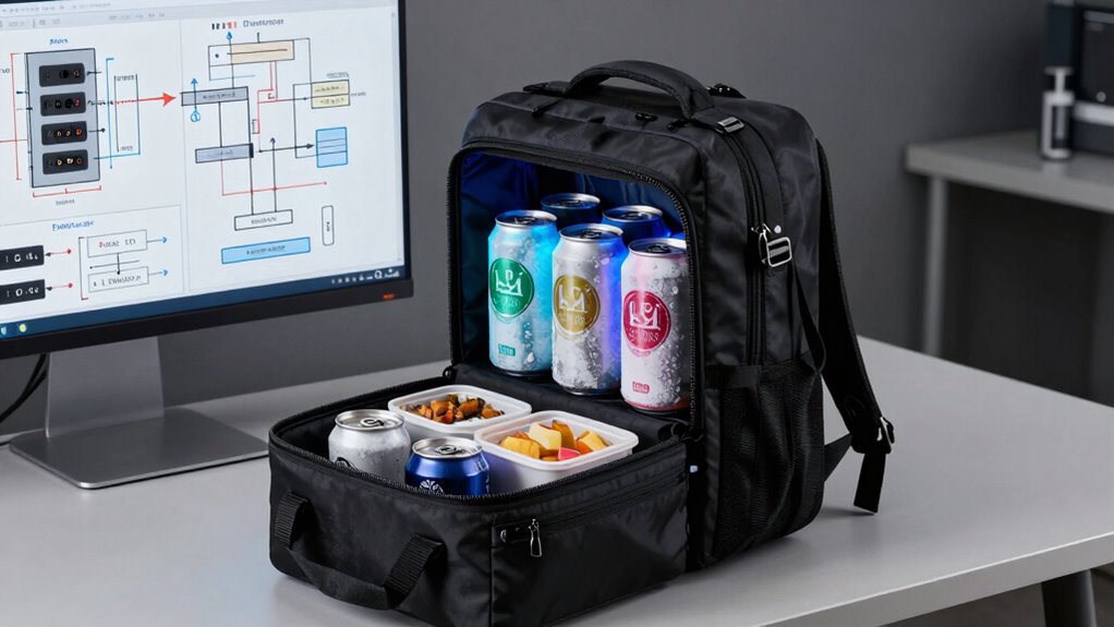 When choosing a backpack cooler, knowing its specs helps you find the right fit for your needs. One of the most vital features to consider is portable insulation. This determines how well the cooler maintains the temperature inside, whether you’re keeping beverages cold or protecting perishable items. High-quality portable insulation minimizes heat transfer, so you don’t have to worry about your contents warming up during long outings. Look for coolers with multi-layer insulation, which combines foam and reflective materials to maximize efficiency. The better the insulation, the longer your items stay chilled without needing frequent access or external cooling sources. Additionally, understanding the impact of contrast ratio can help you evaluate the quality of visual displays or interfaces included with your cooler or related gear. Another key aspect to look at is battery capacity, especially if you’re considering a cooler with built-in cooling or heating functions. The battery capacity directly influences how long the cooler can operate independently before needing a recharge. If you plan to spend a whole day outdoors or on a trip, a higher battery capacity means fewer interruptions to recharge or replace batteries. Many premium backpack coolers now come with rechargeable batteries, often specified in milliamp hours (mAh) or watt-hours (Wh). A larger capacity typically translates into extended cooling periods, which is vital for maintaining a consistent internal temperature during long durations. Some models even feature USB ports or portable power banks, giving you flexibility to recharge your devices on the go. Understanding the specs related to portable insulation and battery capacity helps you plan better. For instance, if you’re heading into a remote area with no power source, choosing a cooler with robust insulation and a long-lasting battery becomes essential. Conversely, if you only need a cooler for short day trips, a model with moderate insulation and a smaller battery capacity might suffice, saving you costs. Keep in mind that higher battery capacity usually adds to the weight of the backpack cooler, so balance your needs with portability. Also, check if the cooler’s power consumption aligns with the battery capacity; some models are more energy-efficient, allowing you to maximize usage without frequent recharges.