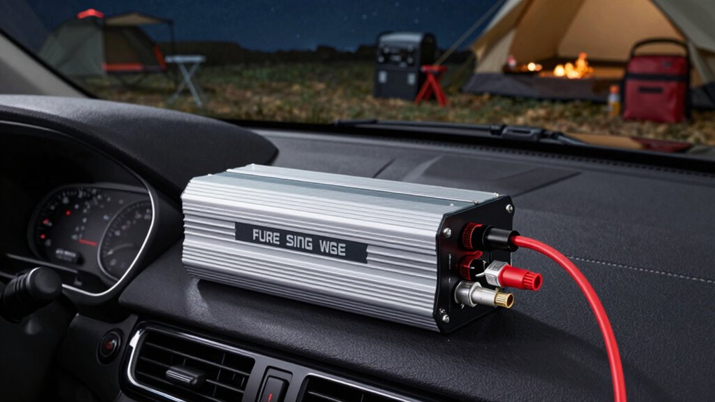 Setting up a pure sine wave inverter for car camping guarantees you can power sensitive electronics reliably and safely. The first step is choosing the right inverter, which hinges on careful inverter selection. You need to match the inverter’s power rating to your anticipated energy demands, guaranteeing it can handle the total wattage of all devices you plan to run simultaneously. Avoid underestimating your needs, as an undersized inverter can cause overloads or shutdowns, disrupting your camping experience. Look for an inverter with a continuous power output slightly above your maximum load to provide a buffer. Also, check for features like overload protection, thermal shutdown, and low-voltage cutoff—these safety measures prevent damage to both your inverter and your devices.