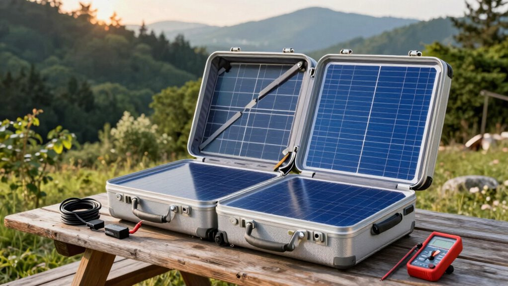 Setting up your solar panel suitcase kit involves more than just placing panels in the sun. You must understand your system’s components and how they work together. Proper battery maintenance keeps your energy storage healthy, while correct inverter sizing guarantees your appliances run smoothly without overloading your system. Take the time to check connections, monitor your batteries, and calculate your power needs accurately. Doing so helps you avoid common mistakes that could diminish your system’s performance or cause costly repairs. With a little attention to detail, you’ll enjoy a steady, dependable power supply during your RV camping trips, making your outdoor adventures more comfortable and worry-free.