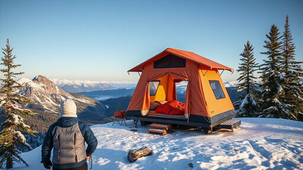 When choosing a 4-season rooftop tent for cold weather camping, ease of setup becomes a top priority. I look for tents with hydraulic or gas strut support systems that let me set up quickly and easily, often within seconds. Pre-assembled components and clear instructions help minimize the time and effort required, especially in harsh conditions. Features like pop-up designs or automatic opening mechanisms are real game-changers, reducing manual labor and making deployment smoother. I also prefer tents with minimal parts and straightforward locking or latching systems, which streamline the process. Additionally, a design that allows easy access and smooth operation is vital when setting up in cold or challenging weather. All these factors guarantee a hassle-free setup, letting me enjoy my adventure sooner.