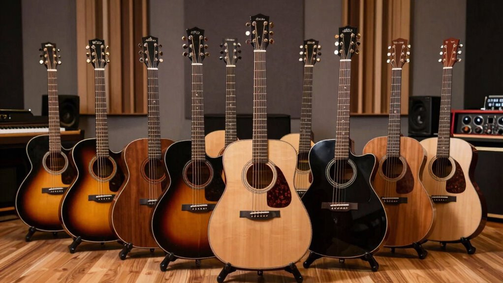 Have you ever wondered how the materials used in an acoustic electric guitar affect its durability? The build materials are essential for ensuring your guitar withstands daily use and environmental changes. All-laminate woods tend to be more resistant to warping and moisture than solid woods, making them a practical choice for durability, though they may offer different tonal qualities. The quality of the wood—like mahogany or spruce—also impacts longevity, especially with regular playing. Metal parts such as tuning machines and fretwire should be made from corrosion-resistant materials like stainless steel or sealed gears to prevent rust. A durable finish, like polyurethane or polyester, shields the surface from scratches and moisture. Plus, reinforced joints and quality craftsmanship bolster overall strength, reducing the risk of damage in transit or during performances.