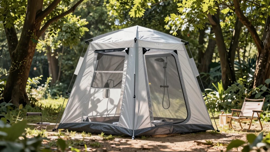 Durability and weather resistance are key factors that can make or break your camping experience, especially when it comes to shower tents. I look for tents made from high-quality, water-resistant materials like polyester or Oxford fabric with waterproof coatings such as PU2000MM to handle rain and moisture. Sealed seams and reinforced frames are essential to prevent leaks and structural damage during storms or strong winds. UV protection, like UPF 50+ or UPF 30+, shields me from harmful sun rays and helps maintain the tent’s material over time. Rust-proof or galvanized steel frames add stability and longevity, even in humid or salty environments. Additional features like removable rainflies and double-layer fabrics provide extra protection, ensuring my shower system lasts through various weather conditions.
