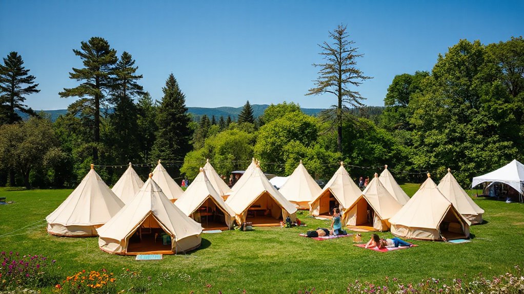 If you’re looking for the best canvas bell tents for glamping festivals in 2026, I’ve found top options that combine size, durability, and comfort. From lightweight models perfect for quick setup to spacious tents with stove jacks for year-round use, there’s something for every outdoor enthusiast. These tents feature weather-resistant fabrics, great ventilation, and easy assembly. Stay tuned if you want to explore detailed features and tips to pick the perfect tent for your adventure.
