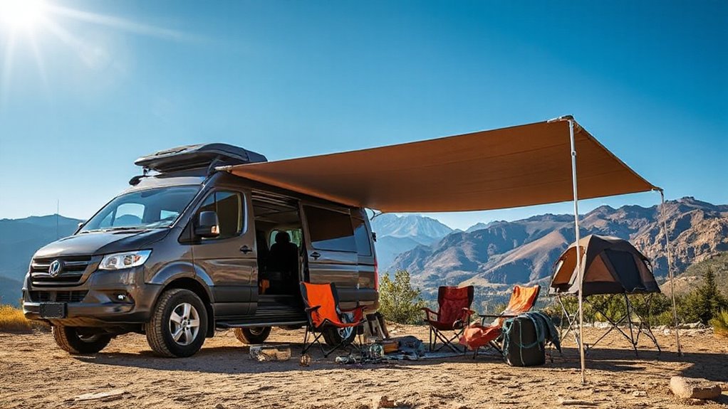 Think of installing a car awning as planting a sturdy tree—you can do it yourself with some basic tools and patience. I’ve found that most models come with clear instructions and mounting brackets, making the process straightforward. Just take your time, follow the steps carefully, and guarantee your vehicle’s surface is clean. With a little effort, you’ll have a reliable shelter ready for your adventures in no time.