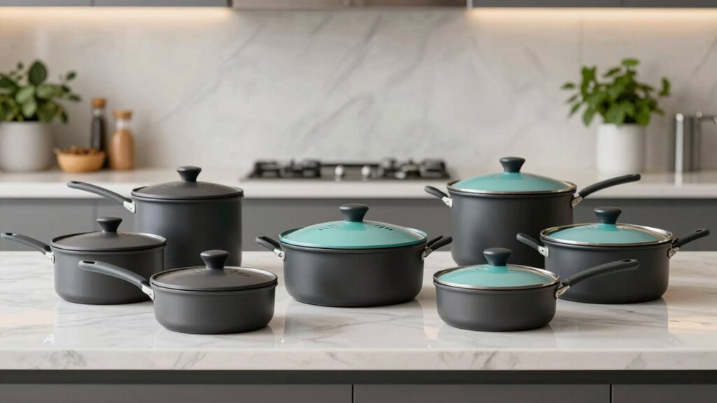 When choosing a Caraway cookware set, I focus on design and material quality to guarantee durability and style. I also consider cooking versatility and safety features to meet my needs in the kitchen. Finally, ease of maintenance, storage options, and organization play a big role in making a practical, long-lasting choice.