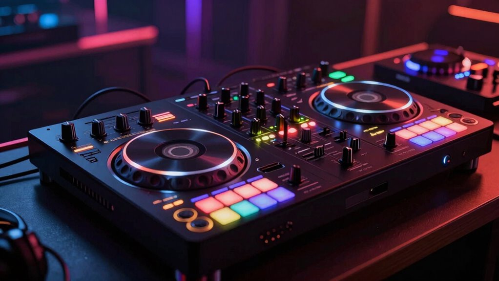 Built-in features and controls markedly enhance a DJ controller’s versatility and ease of use during live sets. Performance pads let me trigger cues, samples, and loops instantly, eliminating the need for extra gear. Dedicated FX and filter controls give me real-time sound manipulation, making shifts more dynamic. Integrated jog wheels with adjustable sensitivity offer precise control over scratching, pitch bending, and track navigation. Multi-function knobs and sliders provide smooth adjustments for volume, effects, and balance, ensuring seamless mixing. Some controllers also include dedicated cue and master volume controls, giving me quick access to critical audio levels. These integrated features streamline my workflow and elevate my performance, making it easier to craft engaging sets without constantly reaching for external equipment.