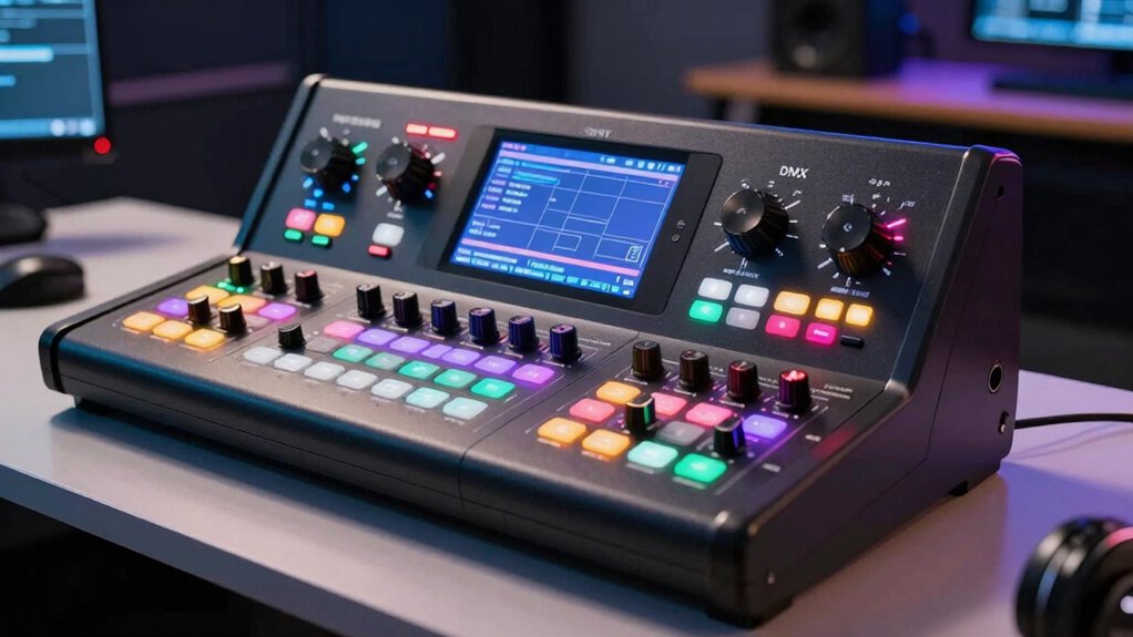 Choosing the right DMX controller feels like finding the perfect playlist—once you do, everything just clicks. I remember my first setup, and how a simple controller transformed my space into a lively, synchronized show. Remember, it’s not about having the most channels but understanding your needs. Think of your controller as the conductor of your light orchestra—pick one that guides your vision smoothly, and you’ll create magic every time.