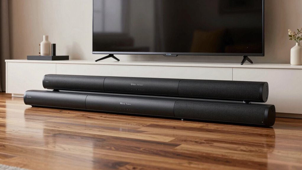 The ideal room size for a $500 Dolby Atmos soundbar is around 200 to 400 square feet. I’ve found that in this range, the soundbar can effectively fill the space without overwhelming it. If your room is smaller, you’ll enjoy immersive audio without losing clarity. For larger rooms, consider adding extra speakers or a subwoofer to enhance the Atmos experience and make certain of consistent sound quality throughout.