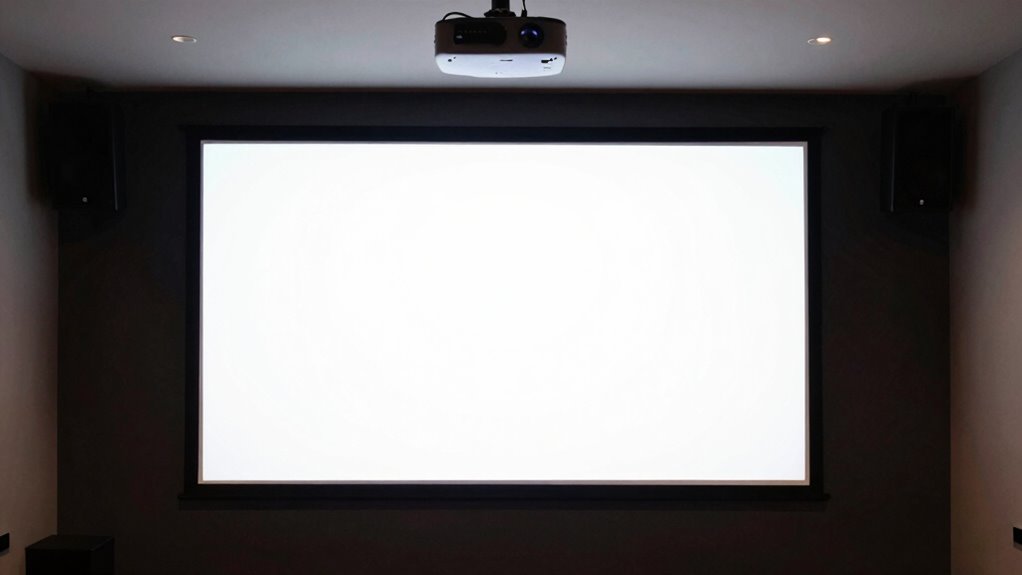 Choosing a fixed frame projector screen with a wide viewing angle is essential for guaranteeing everyone in the room enjoys a clear, bright image regardless of seating position. A viewing angle of 160° or more guarantees consistent image quality across the audience, minimizing brightness and color loss from different spots. High-quality materials in fixed frame screens often provide better uniformity at wide angles compared to flexible or wall-mounted options. The Lambertian diffuser property of the screen surface helps maintain color accuracy and brightness, even at extreme angles. For larger rooms with multiple seating areas, selecting a screen with at least a 170° viewing angle ensures a more immersive experience. Prioritizing this factor helps create a vivid, uniform viewing experience for everyone in your 4K setup.