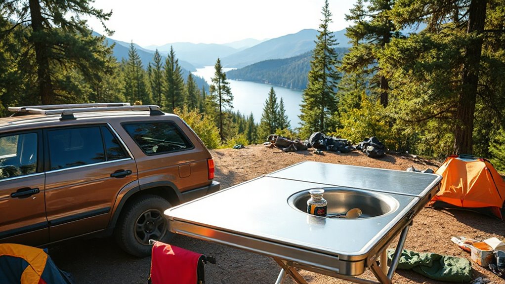 To guarantee your folding camp kitchen works seamlessly with your gear, you need to verify that it can accommodate your stove size, type, and other accessories. Make sure the surface area can handle your specific cookware and utensils without overcrowding, whether you have a two-burner Coleman or Camp Chef stove. Check that the mounting system or slide-out mechanism fits your vehicle’s make and model, like SUVs, trucks, or vans, for a secure attachment. Also, review the storage compartments to ensure they hold your camping supplies and accessories comfortably. Finally, consider the overall weight and size of the kitchen to confirm it aligns with your vehicle’s cargo capacity and available space. Proper compatibility ensures a smooth, hassle-free setup and efficient use of your gear.