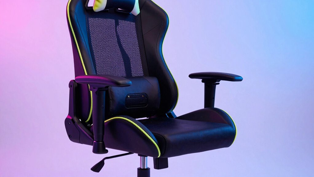 Since long hours of music production can take a toll on your back, ensuring your gaming chair provides adequate lumbar support is essential. Proper lumbar support helps maintain the natural curve of your spine, reducing strain and preventing discomfort. Adjustable lumbar cushions allow you to personalize support, ensuring it fits your unique needs and provides consistent comfort. Ergonomic lumbar support minimizes the risk of lower back pain and helps you stay focused during extended sessions. A well-designed lumbar area encourages good posture, preventing slouching and reducing muscle fatigue over time. High-quality chairs often feature memory foam or pocket spring lumbar supports that contour to your body, offering enhanced comfort. Prioritizing this feature can make a significant difference in your productivity and overall well-being.