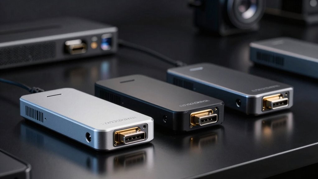 Are you aiming for the highest possible video quality in your live streams? If so, look for capture cards that support up to 4K resolution at 60fps. This guarantees smooth, detailed visuals that engage viewers. Additionally, prioritize models that support high dynamic range (HDR) and 10-bit color depth for vibrant, true-to-life colors. Keep in mind that HDCP compatibility can impact your ability to capture protected content at the highest quality, so choose accordingly. Low latency is vital for real-time streaming; opt for devices with low-latency technology to avoid delays. Finally, support for various output formats like YUY2 or NV12 helps maintain high-quality processing throughout the capture process. These standards are indispensable for professional, high-quality streaming experiences.