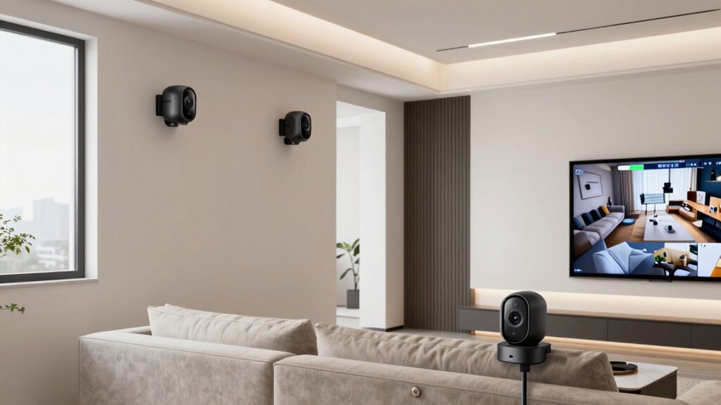 Connectivity and network stability play a vital role in guaranteeing your wireless home security cameras function reliably. I recommend choosing a system that supports your home’s Wi-Fi frequency bands, ideally dual-band (2.4GHz and 5.8GHz), for better connection flexibility. It’s imperative to verify that your cameras and network infrastructure can provide stable bandwidth to handle high-resolution video streams without lag or interruptions. Compatibility with your router’s security protocols, like WPA3 or WPA2, guarantees your data stays protected. Seamless remote access via mobile apps or web portals depends on a reliable internet connection, so check that the system can handle multiple devices simultaneously without slowing down your network. Prioritizing these factors guarantees a consistent and secure surveillance experience.