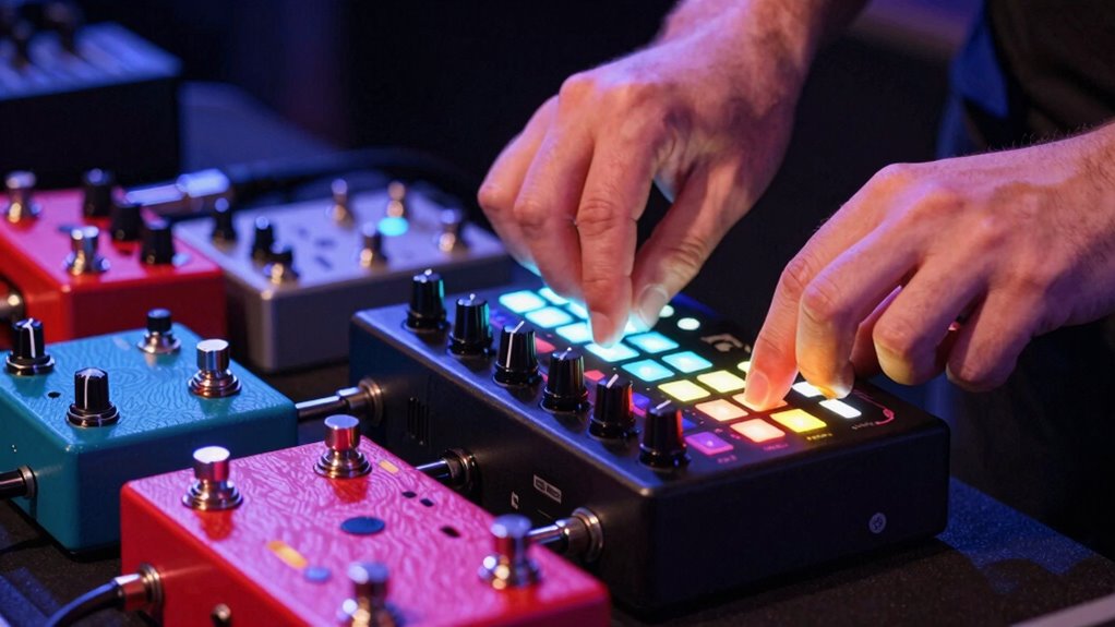 Loop station pedals seamlessly integrate with other live gear by connecting through standard audio and MIDI outputs. I use adapters and cables to sync my pedal with my guitar, keyboard, and effects units, ensuring everything stays in time. I also utilize MIDI to control loops remotely, making shifts smooth. This setup helps me layer sounds effortlessly and stay creative during performances without technical hiccups.