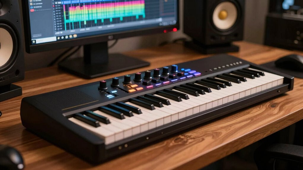 A versatile MIDI controller keyboard needs to offer a wide range of connectivity options to fit seamlessly into your setup. I look for models with USB, MIDI out, and pedal inputs, ensuring I can connect to various devices effortlessly. Wireless MIDI, like Bluetooth, is a bonus for a clutter-free workspace. Assignable controls such as knobs, faders, and buttons are essential for customizing workflows and controlling virtual instruments or DAWs efficiently. Compatibility with your preferred DAW and virtual instruments is *essential* for smooth integration, so I verify support beforehand. Features like deep software mapping, auto-mapping, and standards like NKS enhance control and streamline music production. These connectivity options and customization features make a MIDI controller truly versatile and adaptable to my needs.