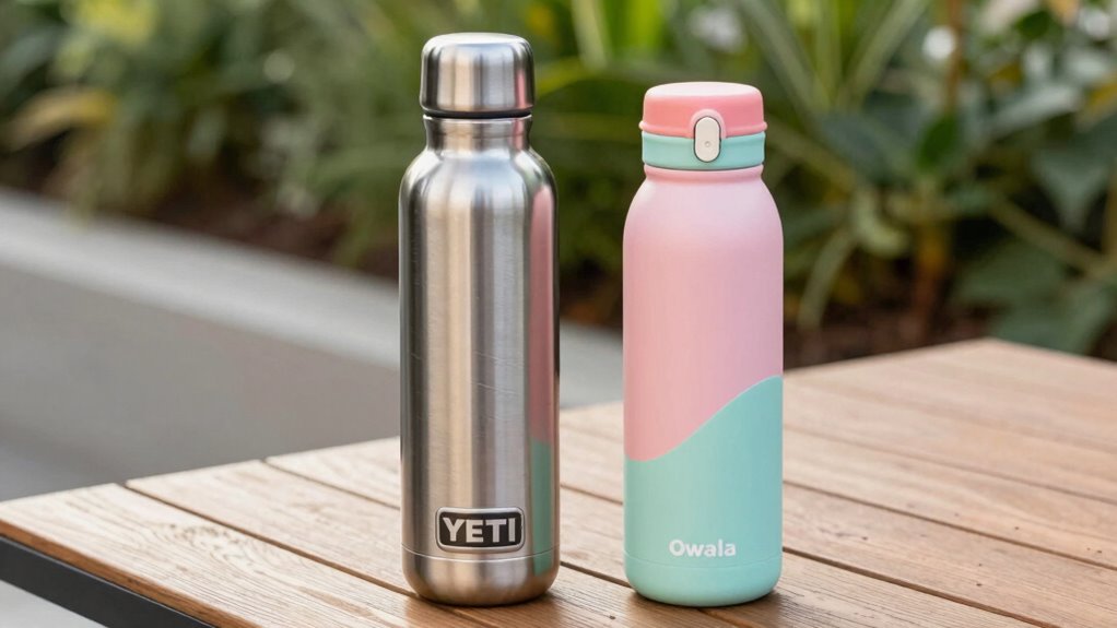 When it comes to durability and materials, both Owala and Yeti prioritize high-quality stainless steel to guarantee their bottles withstand daily use and outdoor adventures. Yeti bottles often feature thicker walls and reinforced construction, making them especially tough in rugged conditions. Their rugged design includes extra protective coatings, adding to their resilience. Owala bottles, on the other hand, focus on a balance of durability and lightweight portability, using BPA-free and lead-free materials for safety and strength. Both brands utilize double-wall insulation, which not only keeps drinks at the desired temperature but also enhances structural integrity. While Yeti emphasizes ruggedness and toughness, Owala aims for a durable yet more portable option, catering to different lifestyle needs.