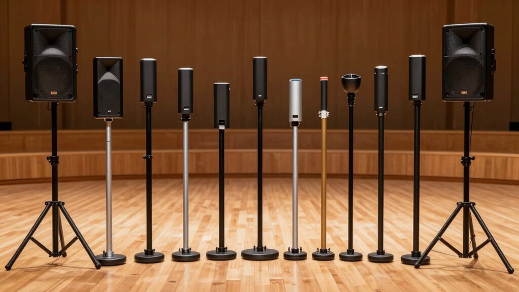 If you’re searching for the 15 best PA speaker stand and pole mount sets for 2026, I recommend considering options like sturdy adjustable tripod stands, heavy-duty wall mounts with swivel and tilt, and versatile pole adapters rated for up to 132 lbs. These supports guarantee stability, portability, and flexibility for any setup, whether for live gigs or permanent installations. Keep exploring, and you’ll find the perfect solutions tailored to your needs.
