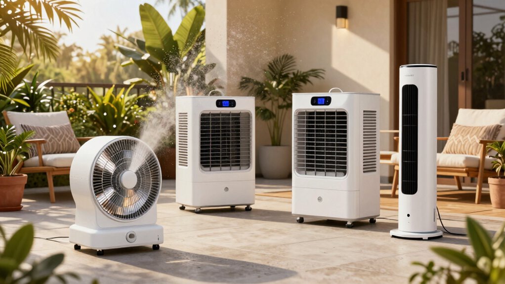 If you’re looking for the 15 best portable cooling systems for patios in 2026, I recommend considering options like evaporative coolers, misting systems, misting fans, and large outdoor units. These provide powerful, adjustable, and easy-to-move solutions tailored to different outdoor spaces. Factors like coverage area, noise level, ease of maintenance, and portability are key. Keep reading to discover detailed insights that help you choose the perfect system for your patio comfort.