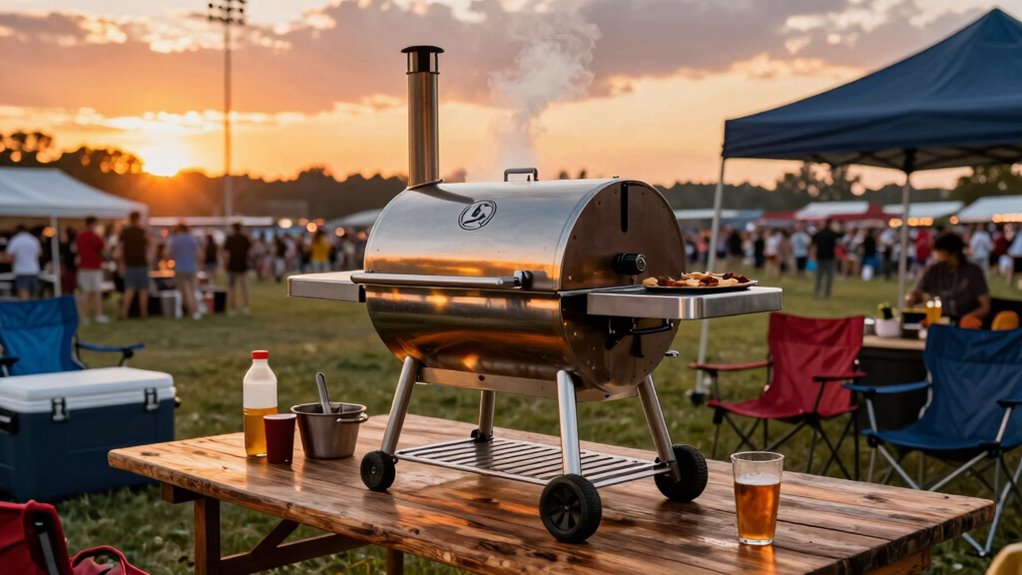Ever wonder if rain can dampen your tailgate party? I say yes, but with some tricks, portable pellet grills can still work effectively in wet weather. I recommend using a quality cover and setting up under a canopy or awning. Keeping the grill sheltered prevents moisture from ruining your cook. With these precautions, you’ll be grilling delicious food rain or shine, making every tailgate memorable!