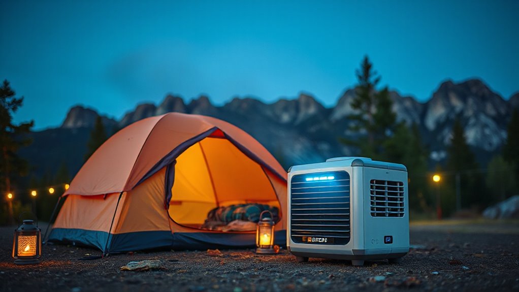 Choosing the right portable tent air conditioner starts with understanding its cooling power needs. I always consider the tent size and aim for units with 3300-5200 BTUs, perfect for small to medium tents. Matching the AC’s cooling capacity to the ambient temperature and humidity levels guarantees maximum comfort. Rapid cooling features are also a plus, as they quickly reduce temperatures by 10-18°F within minutes, helping you settle in faster. Energy efficiency matters too—opting for units under 400W helps conserve battery life and reduces power demands. Most importantly, I make sure the AC can maintain a comfortable temperature in my specific tent size, avoiding overheating and humidity buildup. Getting these factors right ensures a cooler, more comfortable camping experience.