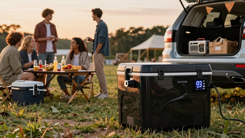 Did you know that some powered coolers can operate in temperatures as high as 120°F? I’ve found that most are designed to handle extreme temperatures, but their efficiency may drop in scorching heat. I recommend selecting a cooler with good insulation and a reliable cooling system. You’ll want to make certain it’s rated for your specific environment to keep your food and drinks cold without fail.