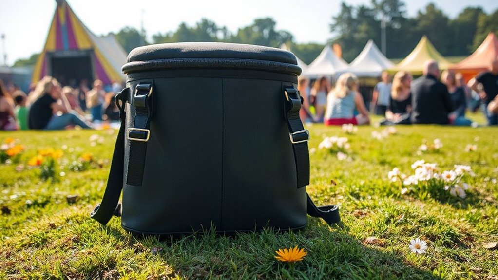 A leak-proof design is vital for keeping your belongings dry and preventing messes during outdoor festivals. Many high-quality coolers feature seamless hot pressing liners that prevent spills even if tipped over, guaranteeing your items stay dry. High-tech sealing methods, like welded seams and sealed zippers, play a critical role in maintaining leak resistance during active days out. Materials such as waterproof nylon combined with advanced PEVA linings further enhance the interior’s waterproof capabilities, resisting punctures and tears. Proper construction, including secure zipper closures and reinforced seams, prevents moisture from escaping and keeps liquids contained. To maintain the leak-proof integrity, regular maintenance is key—avoid overfilling, ensure zippers are fully closed, and handle the cooler carefully. These features make your festival experience mess-free and hassle-free.