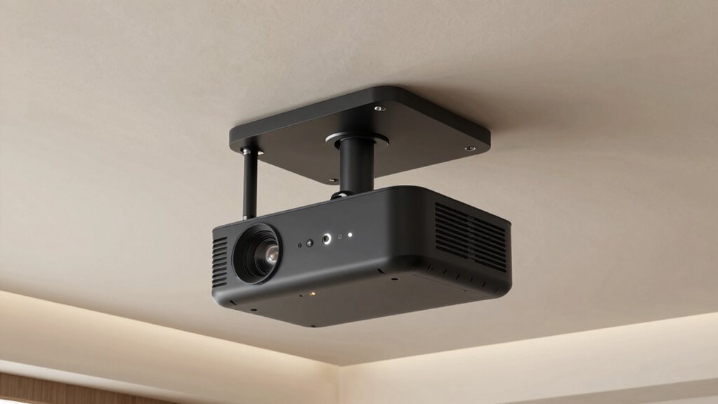 To guarantee your heavy projector is positioned perfectly, look for a ceiling mount that offers multiple adjustability features. A tilt adjustment of at least +/- 15 degrees helps you fine-tune the projector’s angle for ideal image quality. Swivel capabilities of 360 degrees, with additional side-to-side swivel of at least 8 degrees, provide maximum flexibility for different room layouts. An adjustable extension pole, typically from 13 to 25 inches, ensures you can set the right height regardless of ceiling height. Support for both flush and telescoping arms allows versatile installation options. Plus, fine-tuning adjustments for tilt and swivel after installation make it easier to achieve the perfect viewing angle, ensuring your setup is both functional and precise.