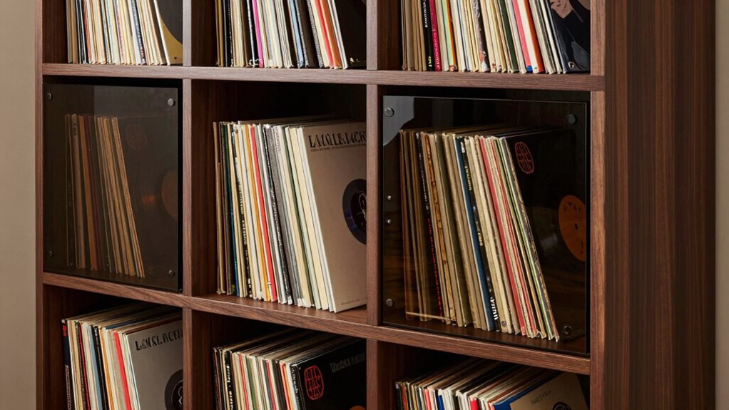 Yes, there are customizable options for large storage shelves. I’ve found that modular units and adjustable shelves allow me to tailor my storage to fit my collection perfectly. You can choose materials, sizes, and configurations that suit your space and needs. I recommend exploring options with removable or adjustable shelves, so you can expand or reorganize as your collection grows. Customizable shelves offer flexibility and guarantee your records stay well-organized.