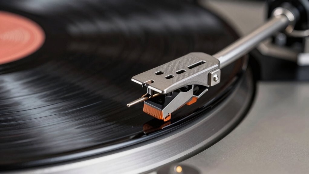 Selecting the right stylus involves more than just tip material; it requires careful attention to tracking force and precision. Proper tracking force, usually between 1.5 and 2.5 grams, guarantees the stylus maintains ideal contact with record grooves, delivering accurate sound. Too much force can accelerate record and stylus wear, while too little increases the risk of skipping or poor groove engagement. The shape of the stylus tip, such as elliptical or Shibata, influences how precisely it follows groove contours, affecting tracking accuracy. It’s vital to follow manufacturer recommendations and use a calibrated gauge to set the correct force. Consistent tracking precision minimizes distortion, protects your records, and prolongs both stylus and record lifespan, ensuring the best possible listening experience.