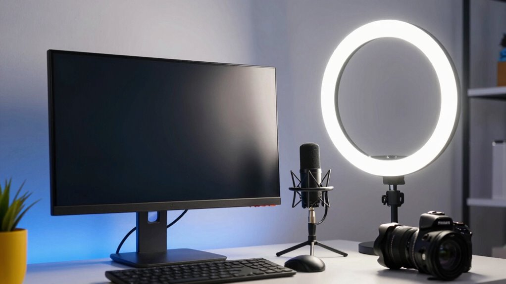 Budget plays a significant role in selecting the right ring light for streaming and content creation. I recommend considering your budget range carefully and comparing different models to find the best features for your price. It’s important to evaluate the overall value by looking at lighting quality, adjustable settings, and durability relative to cost. Cheaper ring lights often lack essential features like adjustable brightness or color temperature, which can affect your content’s quality. On the other hand, investing in a higher-priced model may provide better longevity, more precise control, and extras like remote operation. Remember to balance the cost with how often you’ll use the light and your specific content needs. This approach guarantees you maximize your investment and get the most out of your equipment.