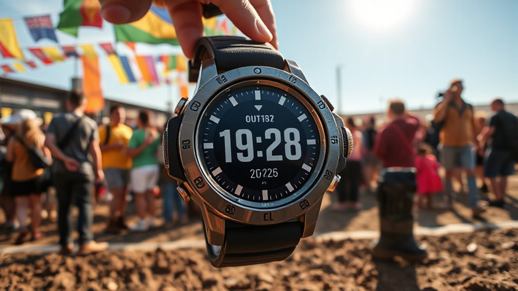 Choosing a rugged smartwatch for festival weekends means paying close attention to its navigation and lighting features, especially since outdoor environments can be unpredictable. Look for devices with high-brightness LED flashlights that can be activated with a single button—perfect for emergency illumination at night. Prioritize smartwatches with integrated compasses to guarantee quick, accurate navigation even when signals are weak or absent. Multiple lighting modes, such as SOS, strobe, or a strong beam, can be lifesavers in various low-light or emergency situations. The lighting must be durable and reliable, functioning flawlessly in rugged conditions. Also, ensure these features are accessible and operable with gloves or in challenging weather, so you’re never caught off guard during your festival adventures.